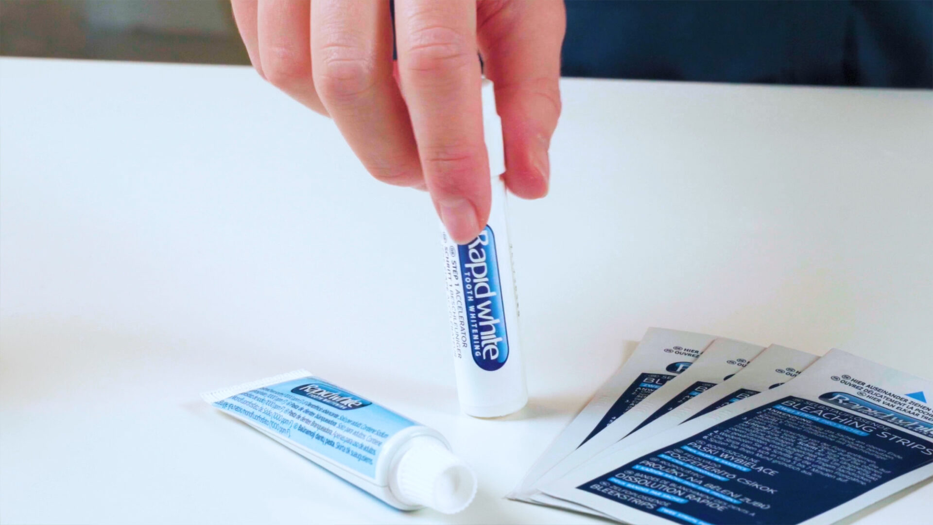As Tiras de Branqueamento Rapid White oferecem um método de branqueamento rápido e eficaz com a sua tecnologia sem peróxido de hidrogénio.
